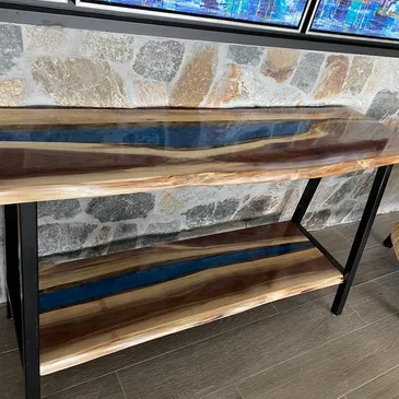 River tables combine natural hardwood slabs with custom resin pours to create a striking “river” effect flowing through the center of the piece. Each river table is fully customizable: choose from wood species, resin color/type, backgrounds & more to create your dream river table.